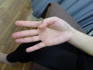 早速症状から伺うと、2週間前から右親指を動かすと痛みが奔るので病院で診てもらったところ骨には異常が無いとのことで、湿布、サポーター、安静を勧められる。それでも良くならないので、手首の治療で医療機関を検索しているなかで当院のHPを見つけてお越し頂きました。続いて痛みの出る動作を確認