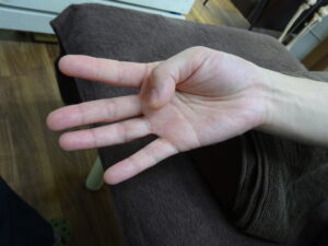<治療前>親指を内側に曲げると痛みでこれ以上曲げられない