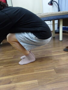<治療前>膝を閉じなければしゃがめるが閉じると手放しではしゃがめない