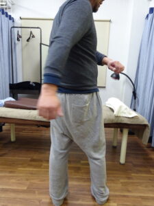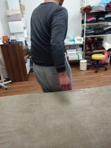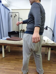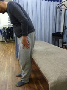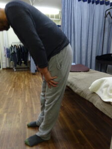 すでに当院の≪治療報告≫にご登場頂いているEさん。今回は今日の昼食後から歩行中の腰の痛みが段々と増してきたとのこと。続いて痛みの出る動作を確認