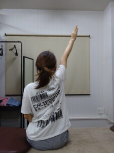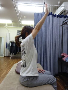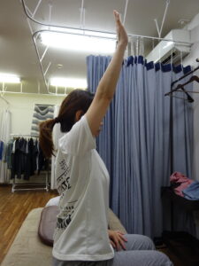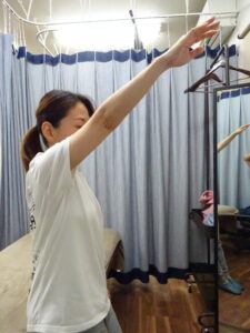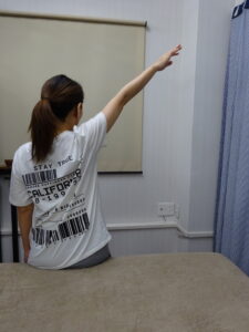 まずは症状を伺うと、半年くらい前に腕を上げると肩が痛くなり、段々挙げられなくなったのでレントゲンを撮ってもらうと四十肩(肩関節周囲炎)と診断される。病院以外にも治療に行って良くなってきたが完治はしてないので、お越し頂きました。続いて痛みの出る動作を確認