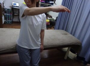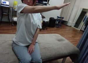 <治療前>腕を外側から挙げるとこの位置で痛くてこれ以上挙げられない
