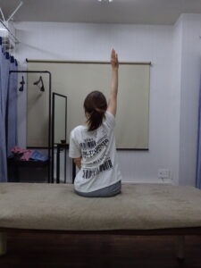 <治療前>腕を前から挙げるとこの位置で痛くてこれ以上挙げられない