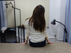 まずは症状を伺うと、1か月くらい前から飛行機で寝ていると首を痛めるということを繰り返しているとのこと。1週間前に痛めた首の治りが悪いのでお越し頂きました。続いて痛みの出る動作