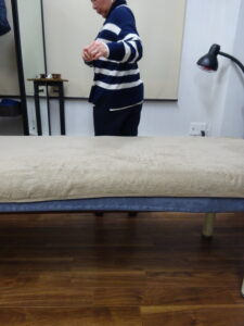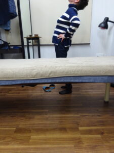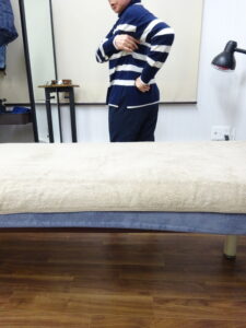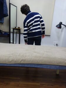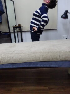ご家族に会うために一時帰国されている間にお越し頂きました。すでに当院の≪治療報告≫頂いておりますが、今回は腰痛の治療。まずは痛みの出る動作を確認