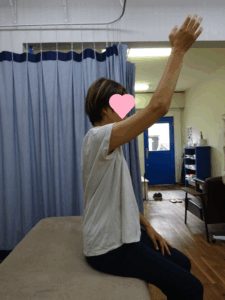 肩の治療で検索したところ当院のHPを見つけてお越し頂きました。まずは症状を伺うと、1年前に肩関節周囲炎を患い腕が上がらないところから、だいぶ上がってきたがまだ痛むことがあるとのこと。続いて痛みの出る可動域を確認![]()