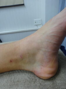 すでに当院の≪治療報告≫にご登場頂いているFさん。今回は試合中に捻じった左足首の治療。まずは足首の状態を確認