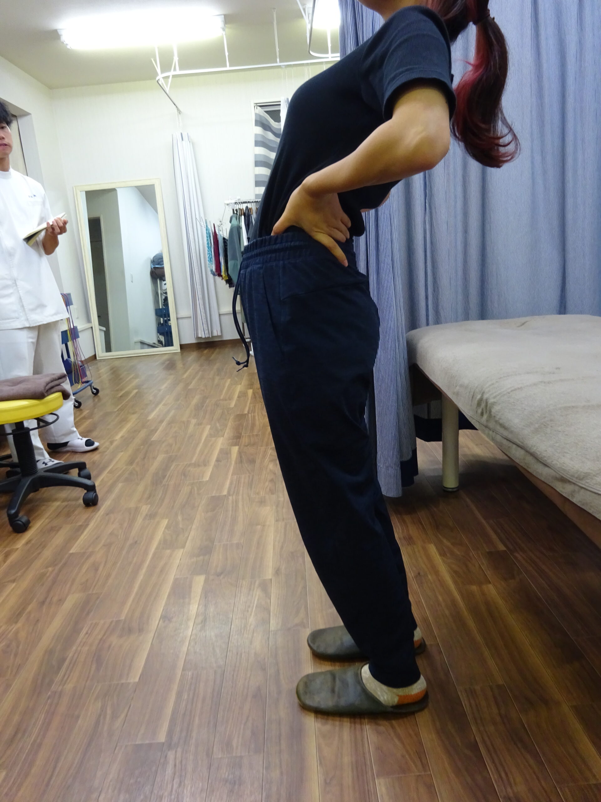 まずは症状を伺うと、就職した1年半前から慢性的に腰が痛い。続いて痛みの出る動作を確認