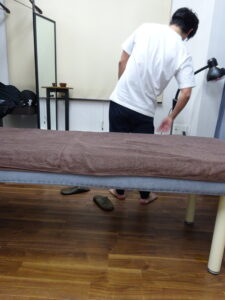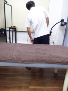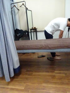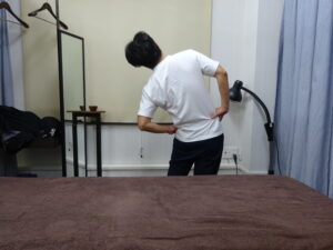 まずは症状を伺うと、10日前にダンベルで筋トレ中に腰を痛めた。ギックリ腰も過去に2回患ったことがあるとのこと。続いて痛みの出る動作を確認