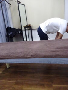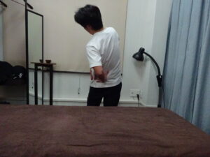 <治療前>前に倒すと、この位置で右腰から中央にかけて痛い