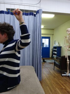 まずは症状を伺うと、2カ月前から着替えなどで左腕を後ろに回すと肩が痛いとのこと。続いて痛みの出る動作を確認