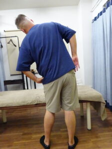 Googleマップで当院を見つけてお越し頂きました。まずは症状を伺うと、2週間前に重い物を持ってから腰の痛みが治らない。続いて痛みの出る動作を確認