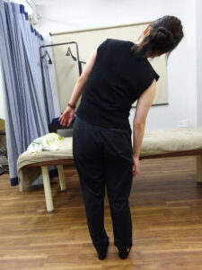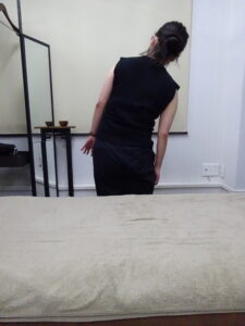 まずは症状を伺うと、4日前から歩くと左腰が攣るように痛いとのこと。10年位前から慢性的に腰が痛くなり、7年前にギックリ腰を経験しているとのこと。続いて痛みの出る動作を確認